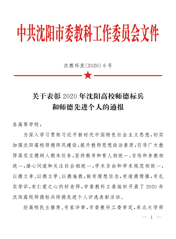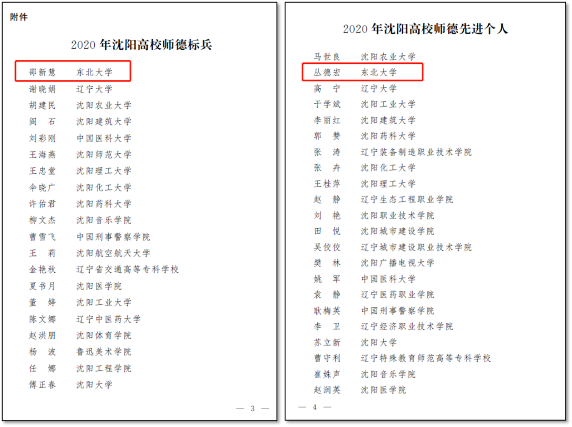 11月19日,中共沈阳市委教科工委正式发布了《关于表彰2020年沈阳高校师德标兵和师德先进个人的通报》,我校理学院邵新慧教授荣获2020年沈阳高校师德标兵荣誉称号,信息科学与工程学院丛德宏教授荣获2020年沈阳高校师德先进个人荣誉称号。
