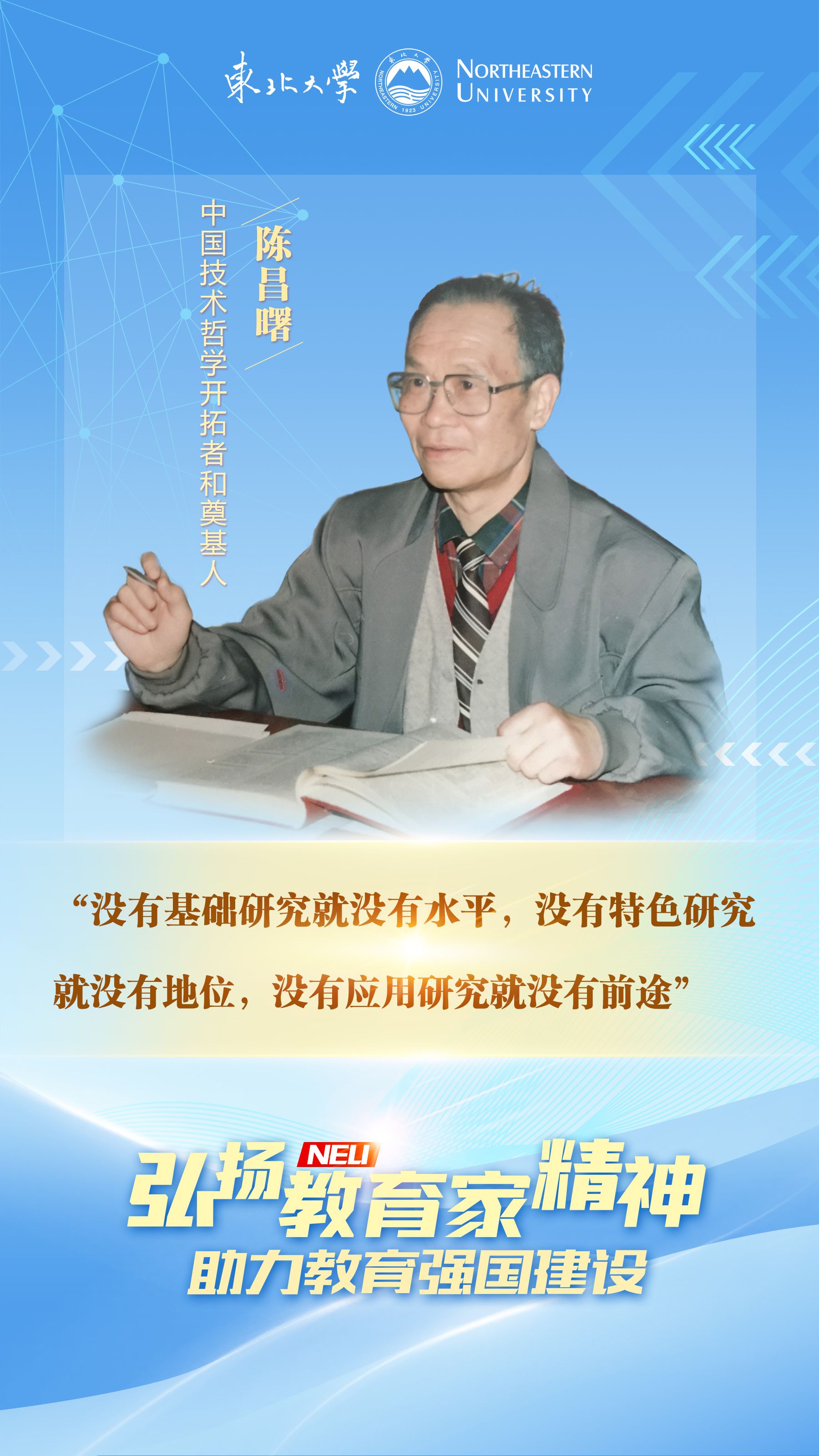 陈昌曙,1950年考入东北工学院(现东北大学)电机系,而后响应国家号召舍弃其酷爱的电气技术转入采矿系,大三年级在学校安排下在马列主义教研室任办事员,于1956年从中国人民大学马克思主义哲学研究班毕业后回校任教于马列主义教研室,在“问学”一生的哲学旅途中开创了独具特色的工程主义传统的中国技术哲学,在全国理工科院校设立了第一个科学技术哲学博士学位授权点,引领创立了中国科技哲学的“东北学派”,入选《20世纪中国知名科学家学术成就概览(哲学卷)》,被公认为20世纪中国著名哲学家。