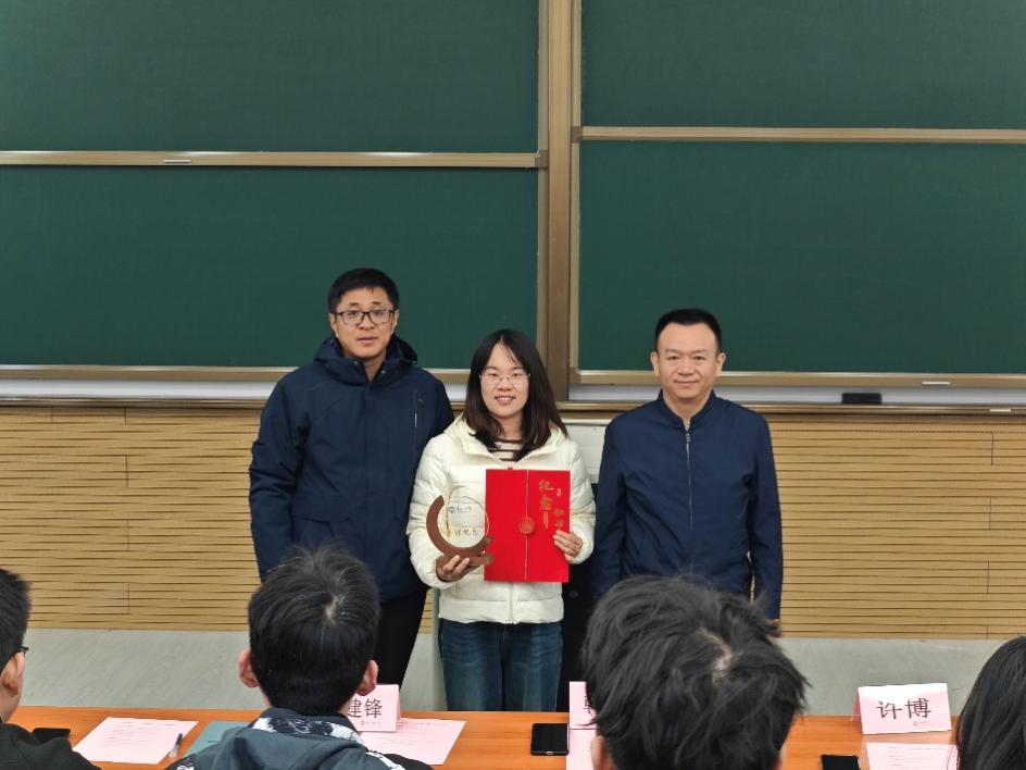 韩斌、许博为新教师颁发纪念证书和摆台。新任课教师孙月表示,感谢学院提供的教学平台与关怀鼓励,将不忘立德树人初心,践行教书育人使命,与学院携手共进、共同成长,努力为学院的发展建设贡献力量。